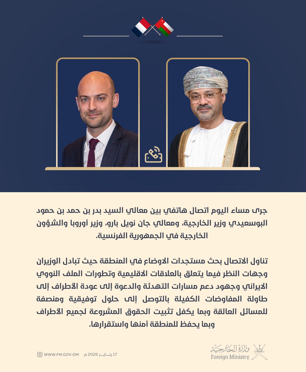وتؤكد سلطنة عُمان تضامنها مع دولة الإمارات العربية المتحدة، وما تتخذه من اجراءات لحفظ بعثاتها الدبلوماسية وأمنها واستقرارها، مجددةً موقفها الرافض لكافة أشكال العنف مهما كانت دوافعه.