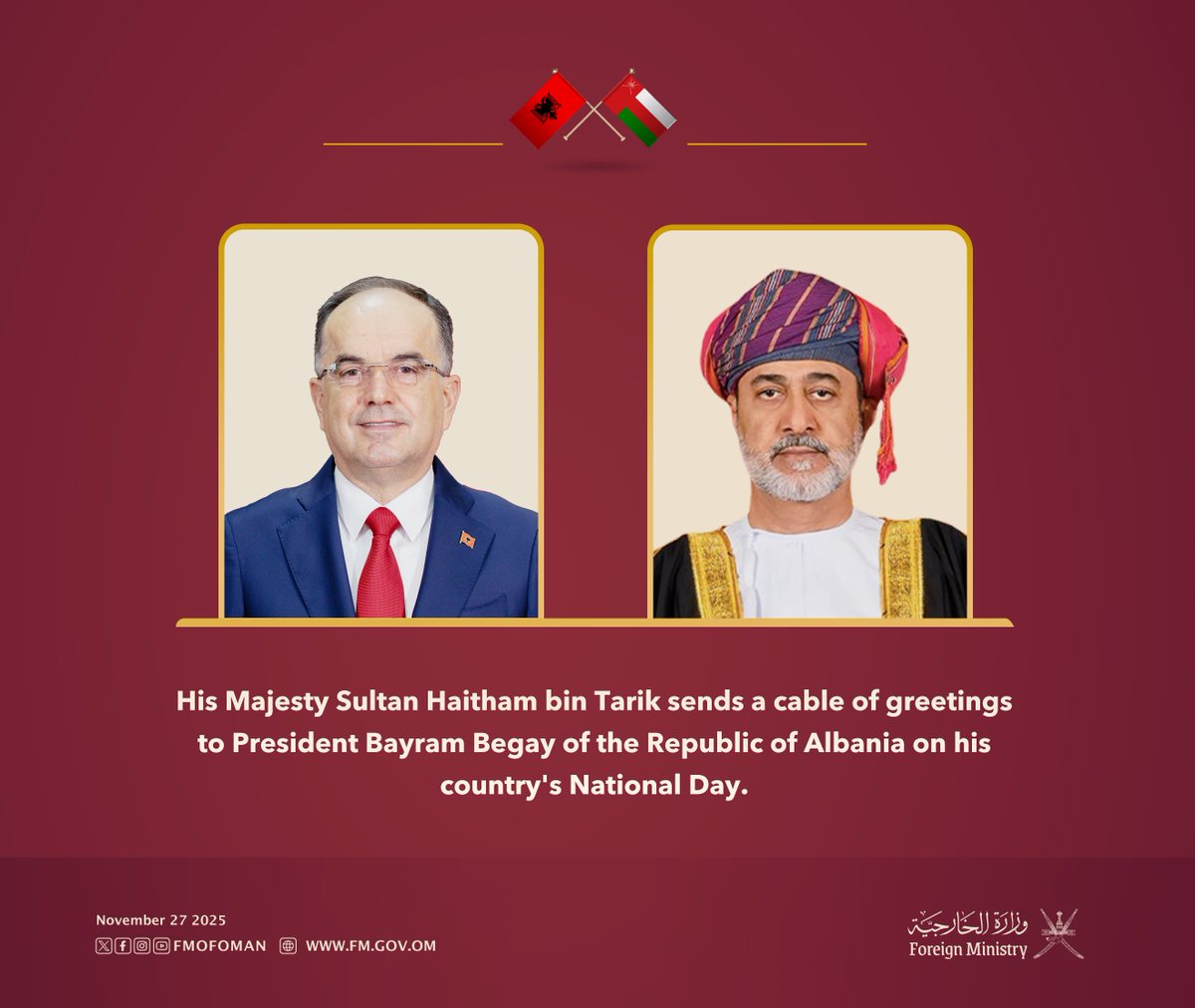 - 19 November 2025The messages on the occasion of National Day expressed sincere wishes to Oman for continued progress.