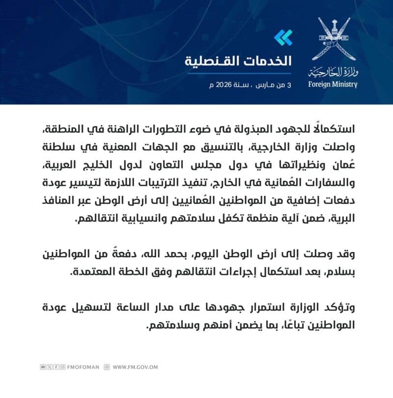 تعلن وزارة الخارجية أن جمهورية أذربيجان قد قررت إعفاء مواطني سلطنة عُمان من متطلبات تأشيرة الدخول، وذلك اعتبارًا من 15 فبراير 2026م وحتى 15 فبراير 2027م.