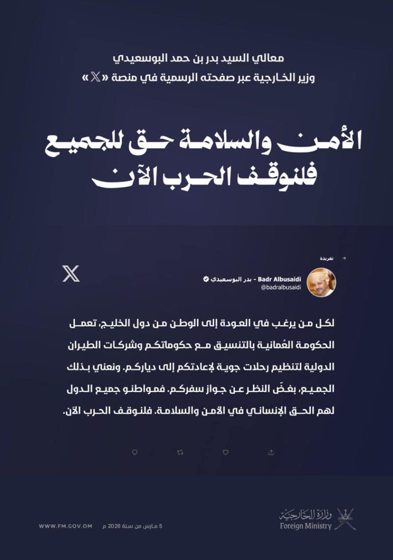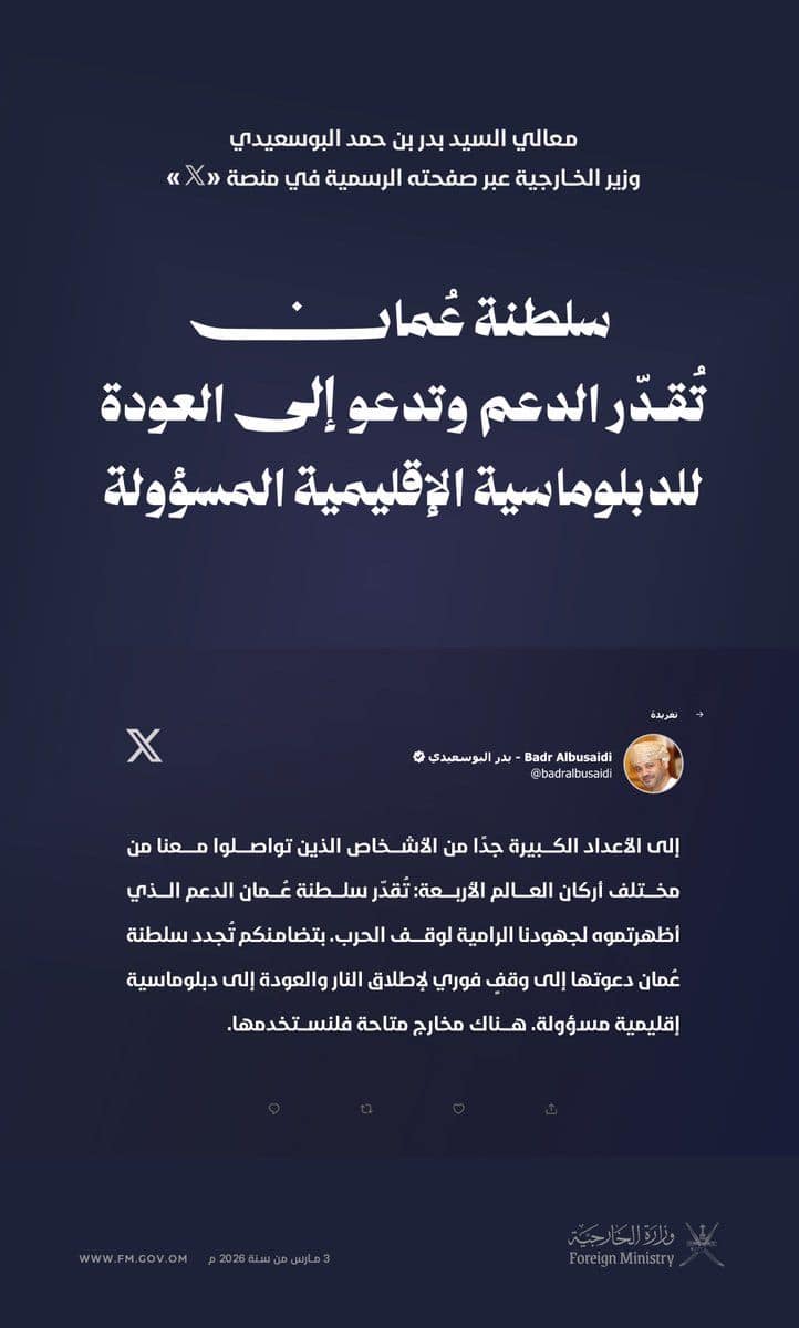 📸 | أجرى معالي السيد بدر بن حمد البوسعيدي @badralbusaidi وزير الخارجية، في مدينة جنيف، لقاءً تشاوريًا مع معالي ستيف ويتكوف، المبعوث الخاص لرئيس الولايات المتحدة الأمريكية، وجاريد كوشنر، وذلك قبيل انعقاد جولة المفاوضات الإيرانية – الأمريكية التي عقدت اليوم في جنيف، برعاية سلطنة عُمان.