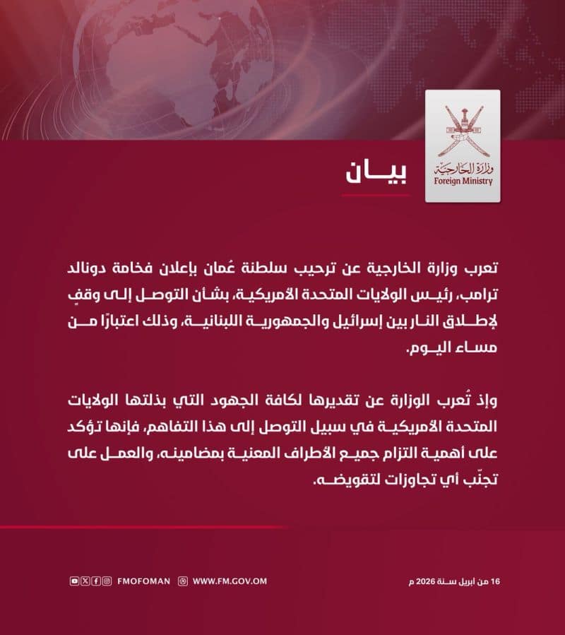 معالي السيد @badralbusaidi وزير الخارجية عبر صفحته الرسمية في منصة X : " سلطنة عُمان تُقدّر الدعم، وتجدد دعوتها إلى وقفٍ فوري لإطلاق النار والعودة إلى دبلوماسية إقليمية مسؤولة ".