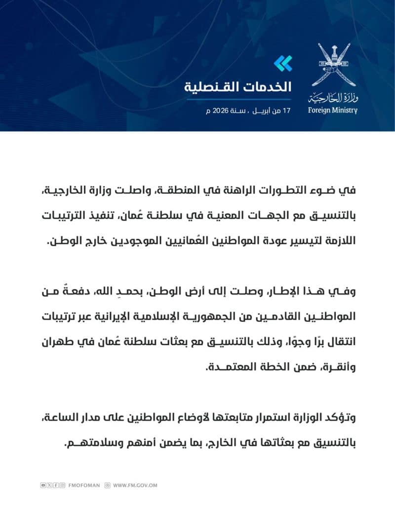 استكمالًا للجهود المبذولة في ضوء التطورات الراهنة في المنطقة، واصلت وزارة الخارجية، بالتنسيق مع الجهات المعنية في سلطنة عُمان ونظيراتها في دول مجلس التعاون لدول الخليج العربية، والسفارات العُمانية في الخارج، تنفيذ الترتيبات اللازمة لتيسير عودة دفعات إضافية من المواطنين العُمانيين إلى أرض الوطن عبر المنافذ البرية، ضمن آلية منظمة تكفل سلامتهم وانسيابية انتقالهم.